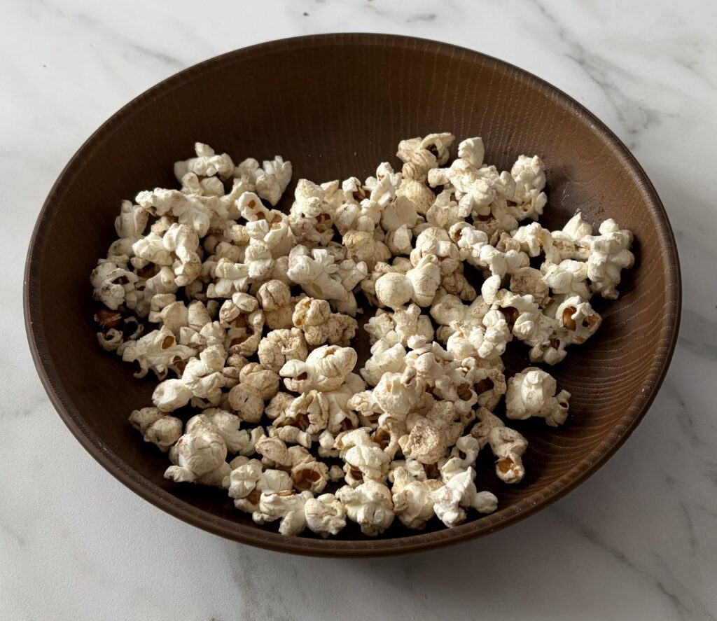 出来上がったポップコーンに軽く塩を振って早速食べてみました!